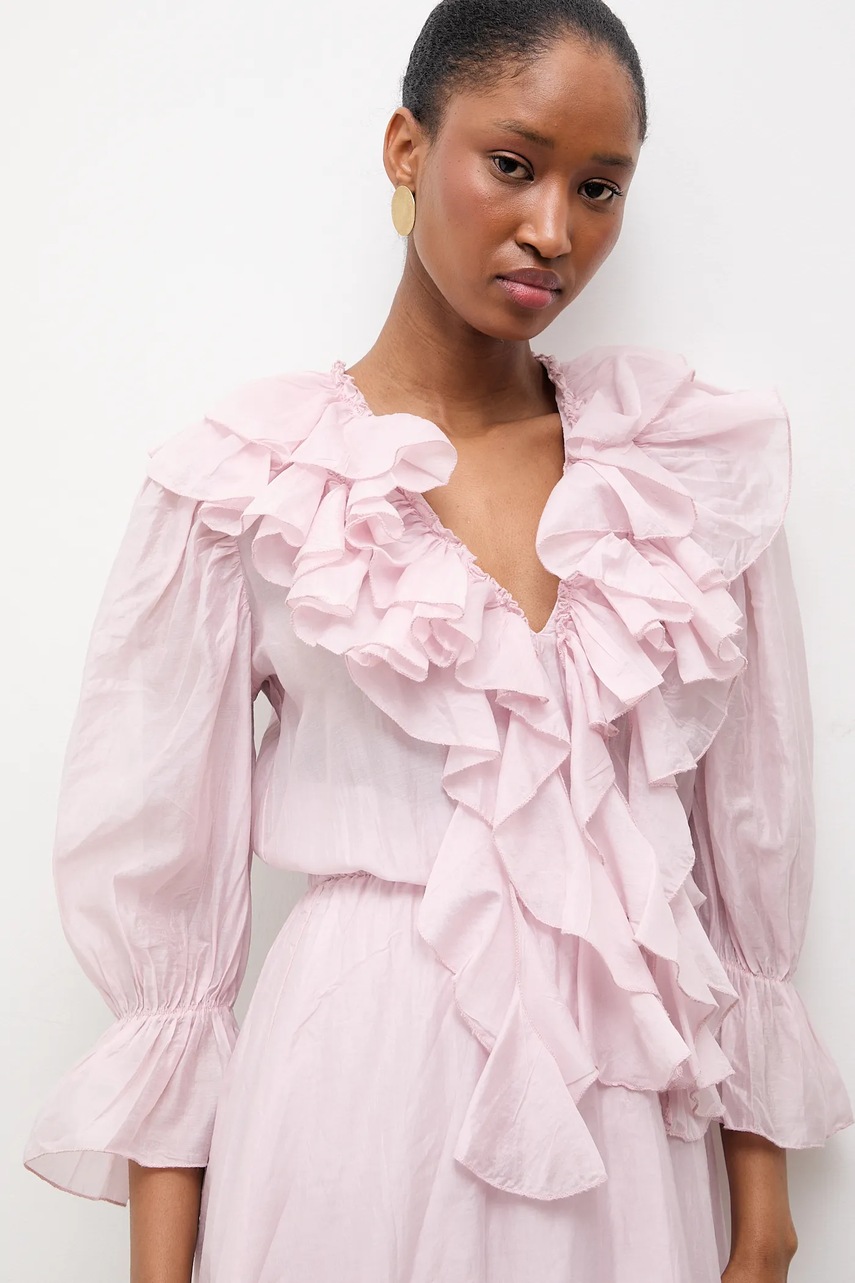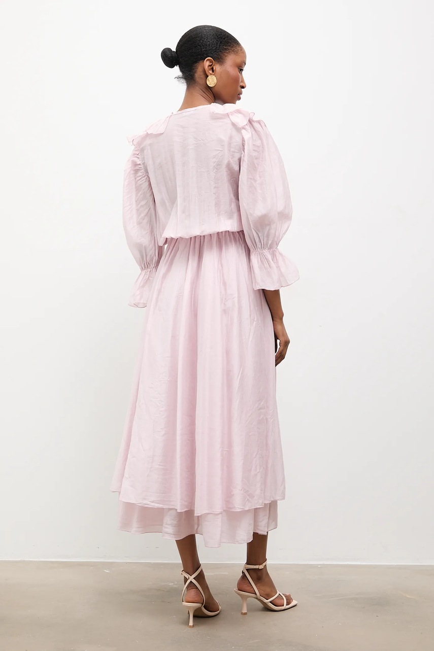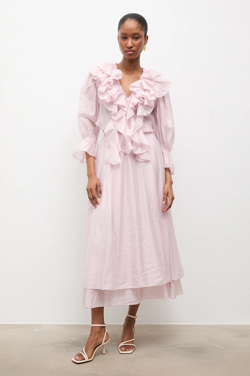 Oranžové maxi šaty Answear.LAB jsou rozšířený model, které nabízejí lehkost a volnost pohybu a podtrhují ženskou siluetu. Vyrobeny z látky s lyocellem, s nabíranými 3/4 rukávy a výstřihem do V s volány, představují skvělou volbu pro různé události. Hodí se jak pro každodenní, tak i pro formálnější outfity, od letních setkání po koktejlové večírky.