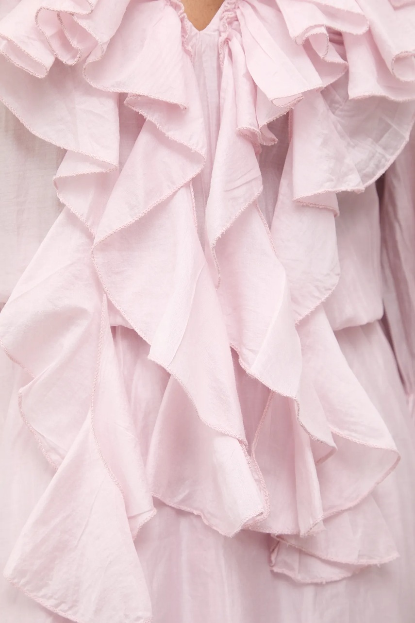 Oranžové maxi šaty Answear. LAB jsou rozšířený model, které nabízejí lehkost a volnost pohybu a podtrhují ženskou siluetu. Vyrobeny z látky s lyocellem, s nabíranými 3/4 rukávy a výstřihem do V s volány, představují skvělou volbu…