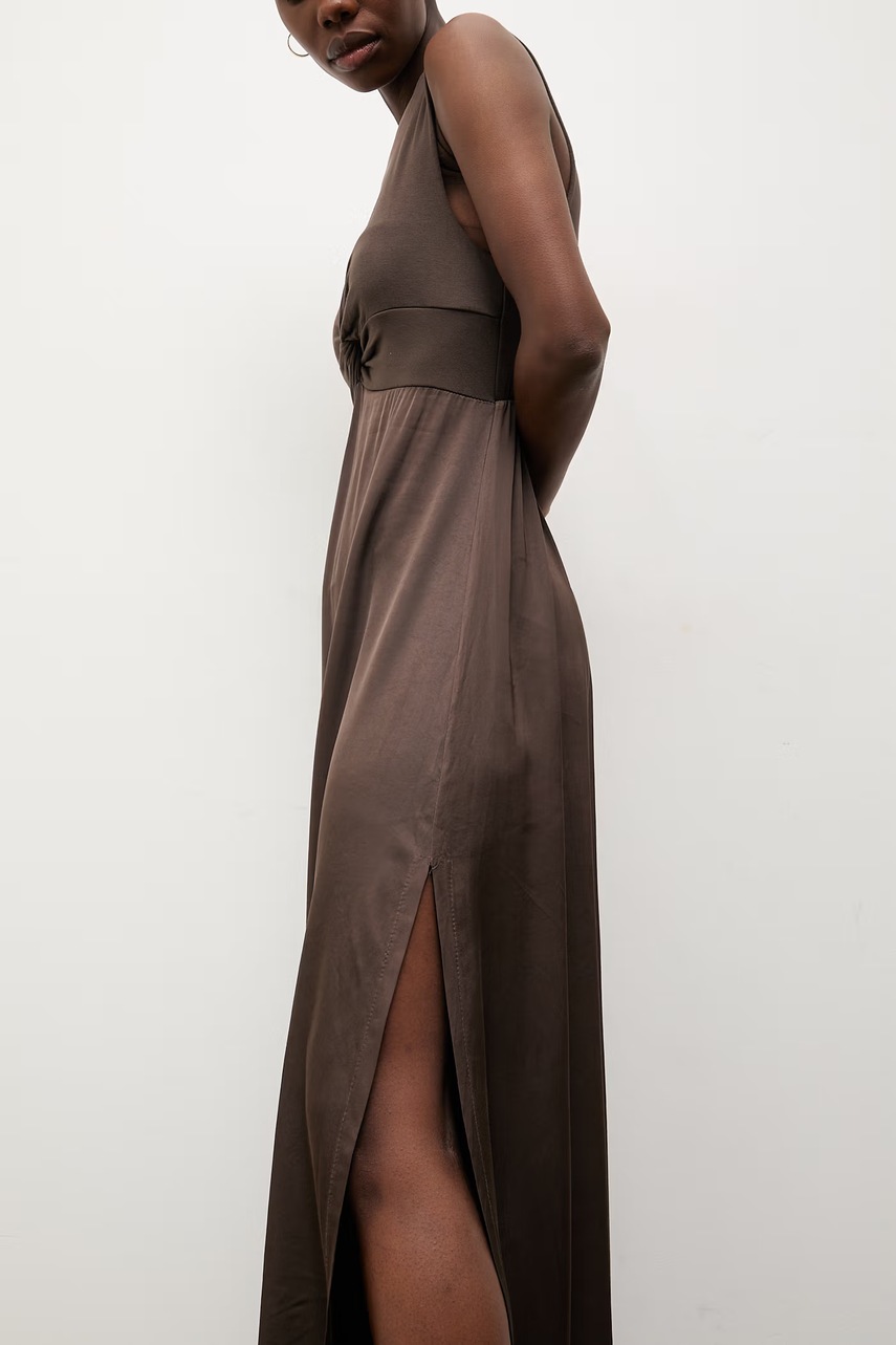 Hnědé maxi šaty Answear.LAB v rozšířeném střihu neomezují v pohybu a zdůrazňují ženskou siluetu. Jsou vyrobeny z elastické viskózy, která zajišťuje lehkost a prodyšnost, díky čemuž se skvěle hodí pro ležérní outfity i společenská setkání.