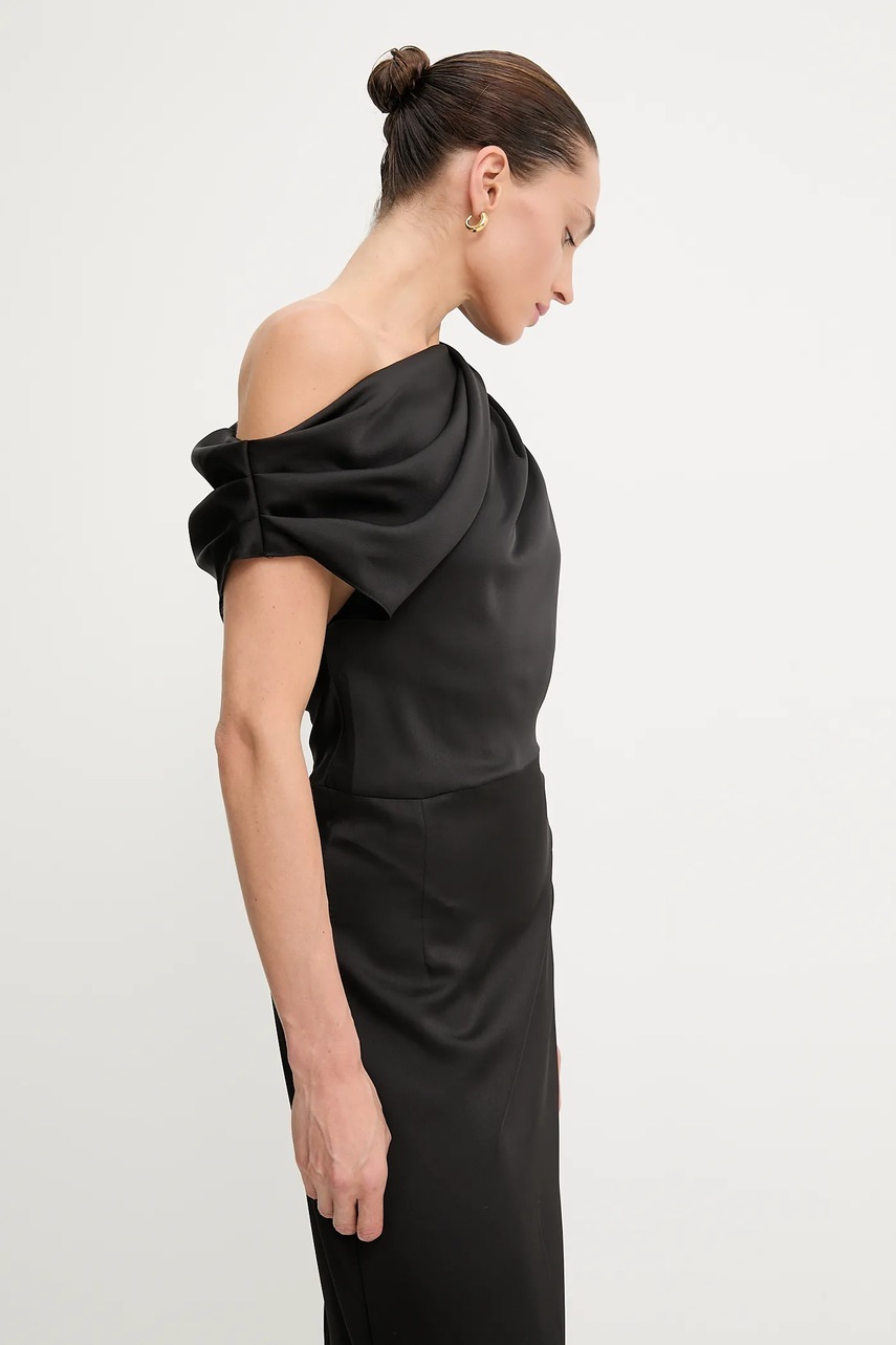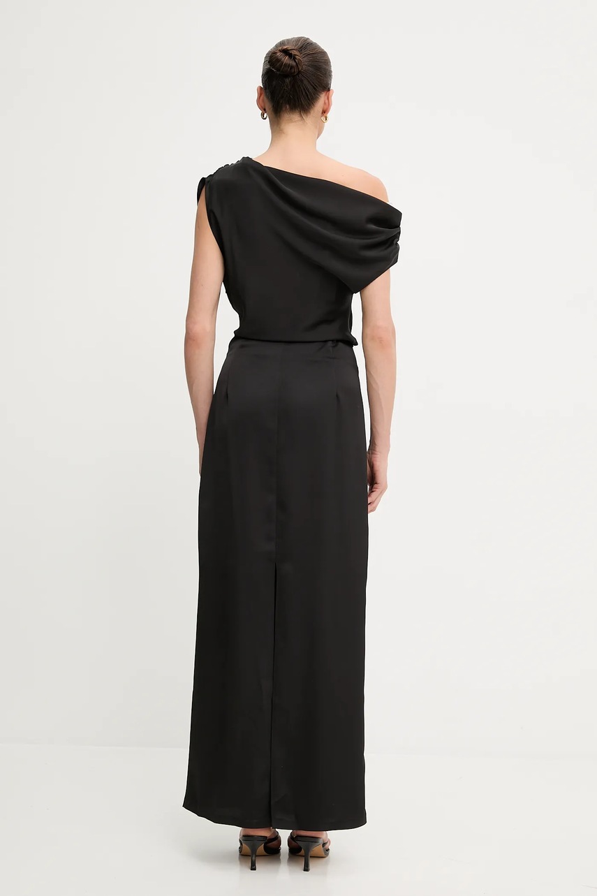 Černé maxi šaty Answear.LAB jsou večerní a koktejlový model, který se vyznačuje luxusním saténovým materiálem a asymetrickým vodopádovým výstřihem. Jejich jednoduchý střih s decentním rozparkem vzadu umožňuje volnost pohybu a zároveň zdůrazňuje sofistikovaný styl. Tento model se skvěle hodí na slavnostní večeře, bankety nebo svatby a dodá stylizaci elegantní a glamour charakter.
