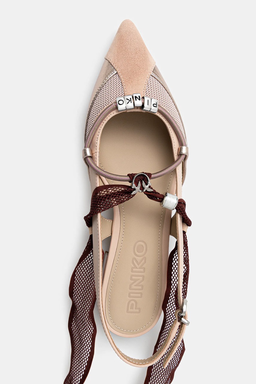 Baleríny z kolekce Pinko. Model vyroben z kombinace přírodní kůže, semišové kůže a textilního materiálu. Každá bota je zabalena v ochranném plátěném pytlíku.