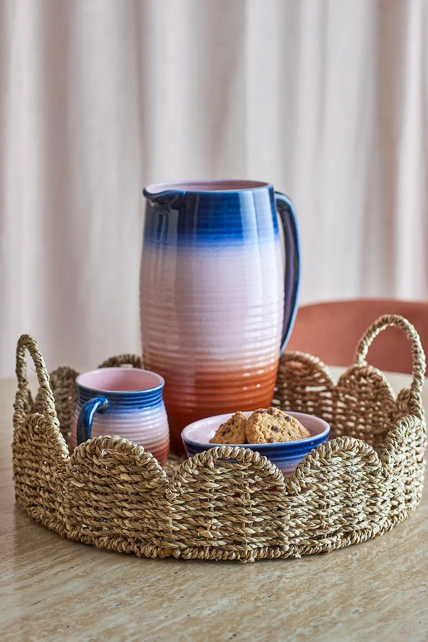 Servírovací tác Bloomingville je elegantní a funkční prvek vybavení, který podtrhuje přírodní kouzlo interiéru a usnadňuje organizaci prostoru. Je ideální pro milovníky boho a organického designu. Je vyroben z přírodní mořské trávy s příměsí železa, vyznačuje se hustě tkaným povrchem, vlnitým okrajem a praktickými uchy ve tvaru smyček. Jeho béžová barva a jedinečná textura činí každý tác unikátním a vnáší do domova hřejivou a útulnou atmosféru.