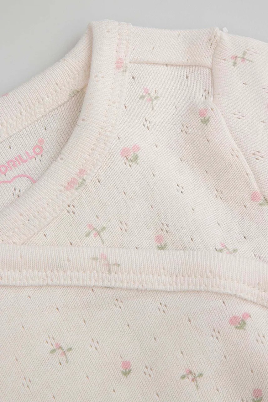 Kojenecké body Coccodrillo je zavinovací body s krátkým rukávem, které zajišťuje pohodlí a volnost pohybu miminka. Vyrobeno z měkké, prodyšné bavlny, je vhodné pro teplé dny. Jemný květinový vzor na ecru pozadí dodává šarm a ažurová struktura materiálu podtrhuje jemnost a lehkost. Praktické zapínání na patentky usnadňuje rychlé přebalování a zavinovací střih podporuje pohodlí a bezpečnost citlivé dětské pokožky.