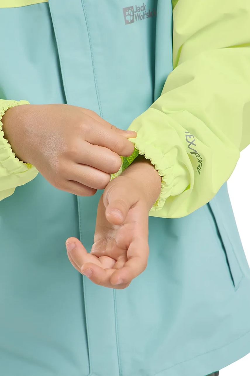 Dětská bunda do deště z kolekce Jack Wolfskin. Lehký zateplený model, vyroben z voděodolného materiálu.