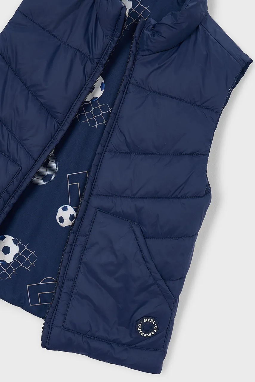 Dětská vesta z kolekce Mayoral. Zateplený model, vyroben z kombinace hladkého a vzorovaného materiálu. Oboustranný model, zajišťující plnou funkčnost při použití na obou stranách.
