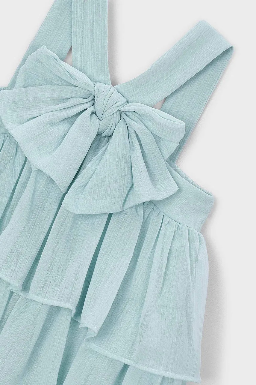 Dětské šaty z kolekce Mayoral. Model vyroben z jednobarevné pleteniny. Model z extrémně příjemného materiálu s vysokým obsahem viskózy.