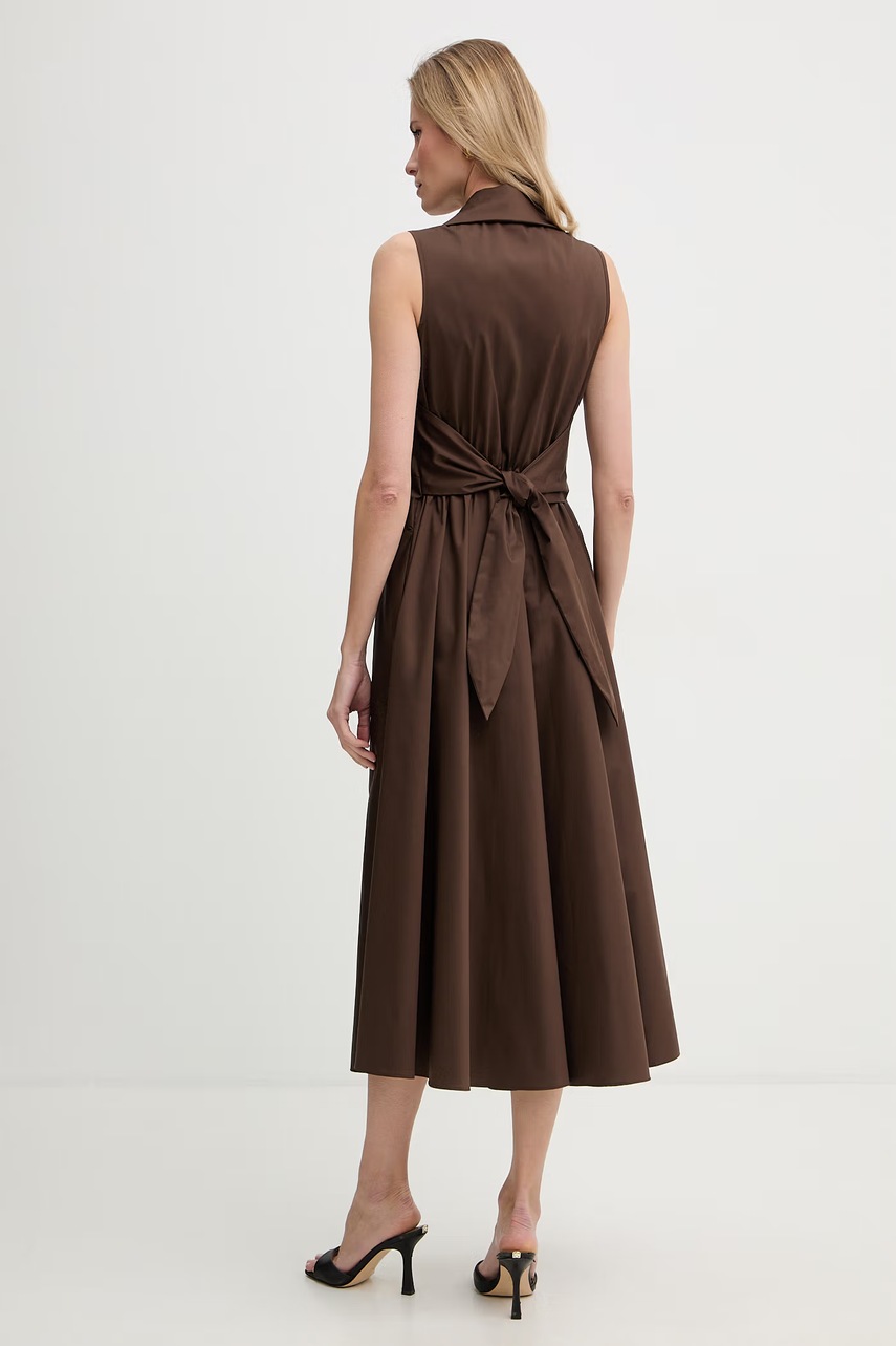 Hnědé midi šaty Fracomina jsou modelem rozšířeného střihu, který spojuje klasický styl s moderním pohodlím. Tento model, ideální na večerní vycházky a koktejlové večírky, vyniká minimalistickým designem a smyslem pro detail. Skvěle se hodí na oslavy, společenská setkání nebo romantické večeře a podtrhne vaši eleganci a ženskost.