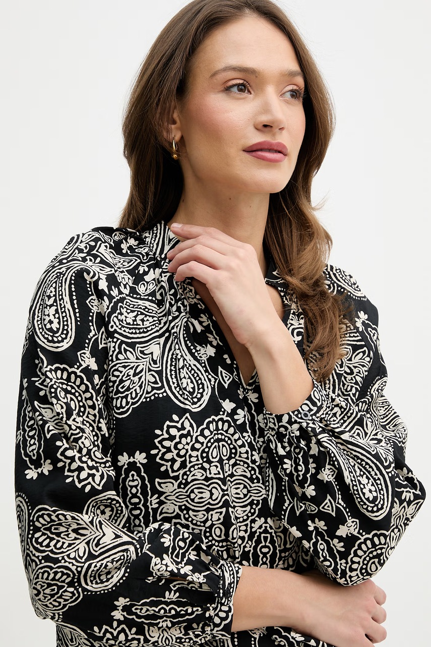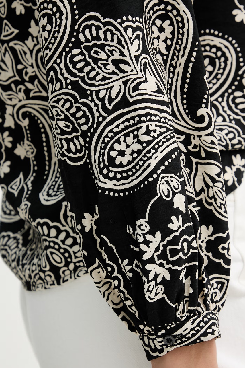 Halenka z kolekce OUI. Model vyroben ze vzorované látky. Model ze vzdušného materiálu s vysokým obsahem viskózy.