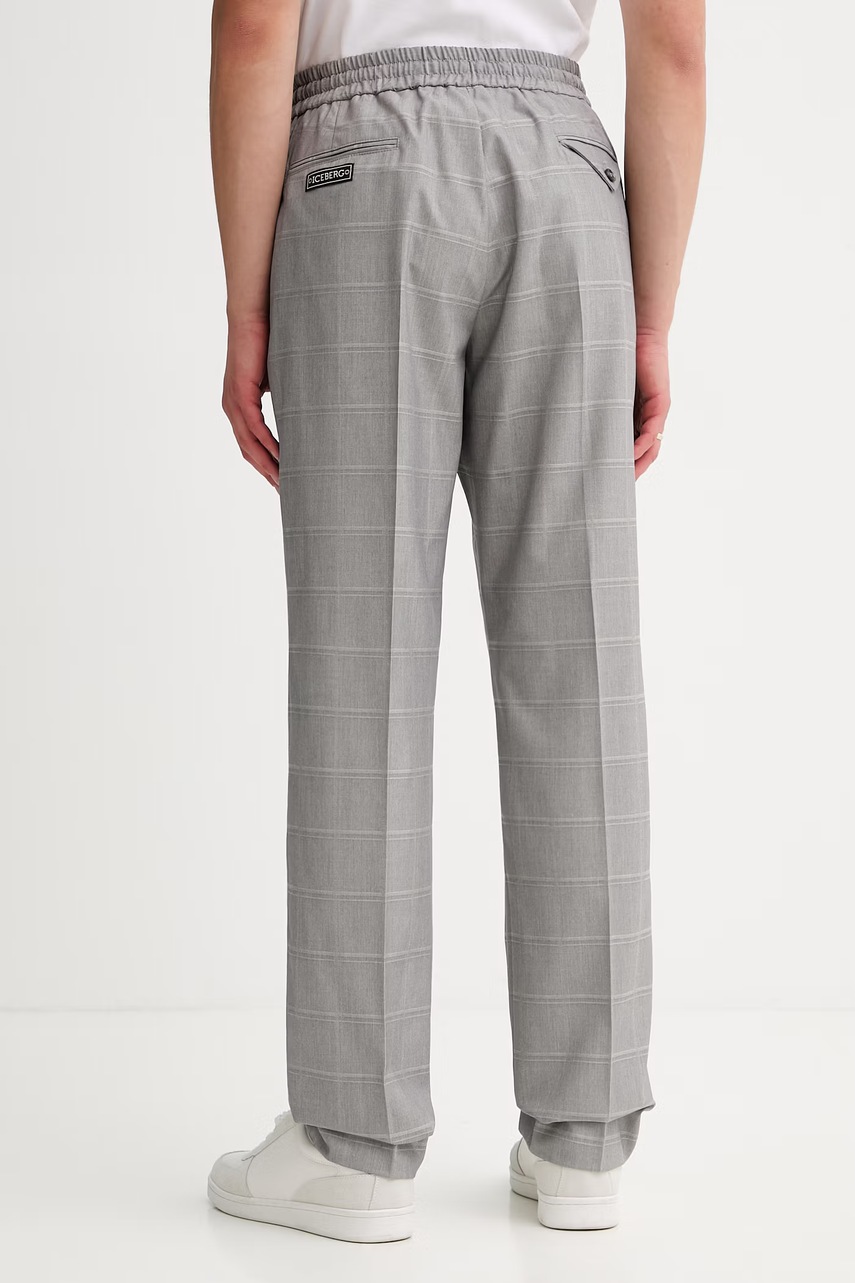 Kalhoty kolekce Iceberg. Model vyroben z tenké, nepružné tkaniny. Díky obsahu polyesteru je materiál odolnější proti mačkání.