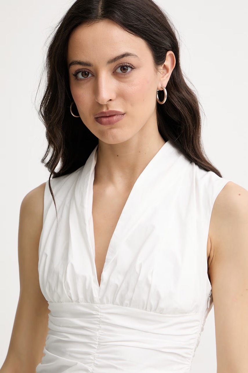 Bílé mini šaty Liu Jo jsou okouzlující volbou s balonkovým střihem, které se vyznačují lehkostí a pohodlím při nošení. Jsou vyrobeny z čisté bavlny, zajišťují pohodlí v teplých dnech a jejich hladký vzor a ozdobné řasení podtrhují jejich jedinečný charakter. Tento model se skvěle hodí na letní společenská setkání a jako součást outfitů pro méně formální akce.
