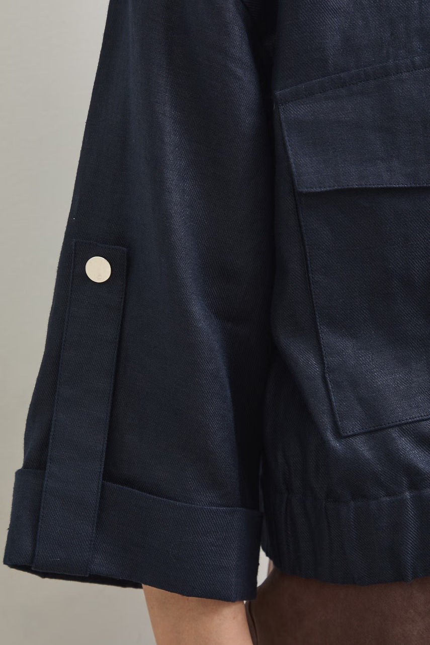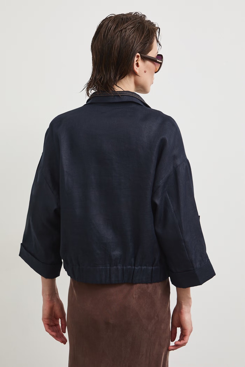 Tmavě modrý bomber Medicine je lehká volba pro ženy, které si cení volnosti a přírodních tkanin, a skvěle doplní jarní i letní stylizace. Je vyroben výhradně ze lnu, což podporuje pohodlné nošení v teplejších dnech, a jeho volný oversize střih podtrhuje neformální charakter. Tento model v sobě spojuje klasický střih bomberu s prodyšností lněného materiálu a stává se tak základem pro ležérní outfity.