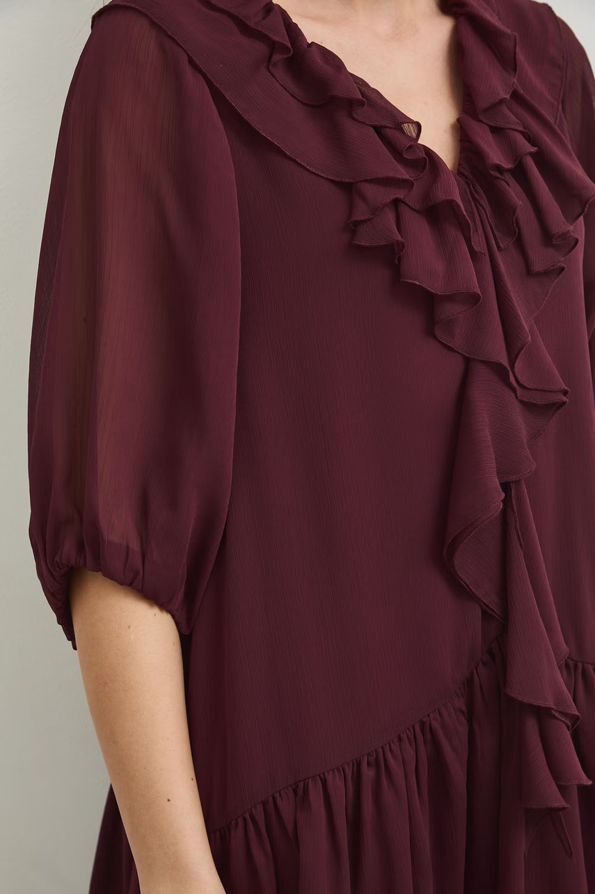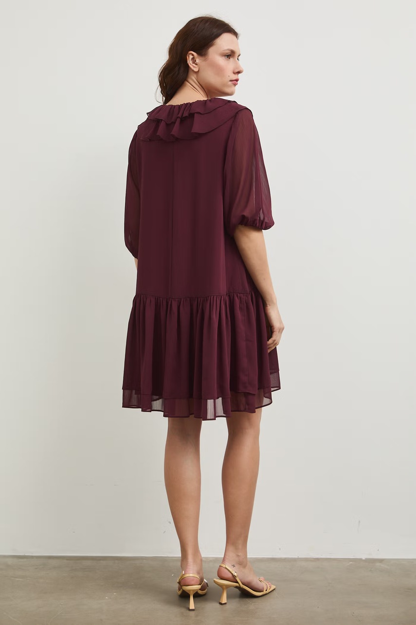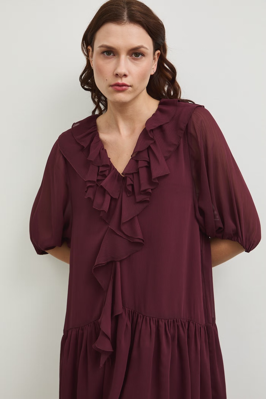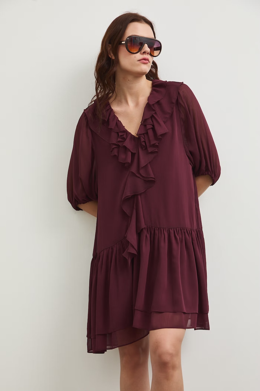 Černé minišaty Medicine jsou koktejlové šaty rozšířeného střihu, které se vyznačují nabíranými 3/4 rukávy a ozdobnými volány. Tento okouzlující střih s výstřihem do V a viskózovou podšívkou zajišťuje pohodlné nošení a podtrhuje ženský styl. Jsou skvělou volbou pro zvláštní příležitosti, jako jsou večírky, společenská setkání nebo romantické večeře.