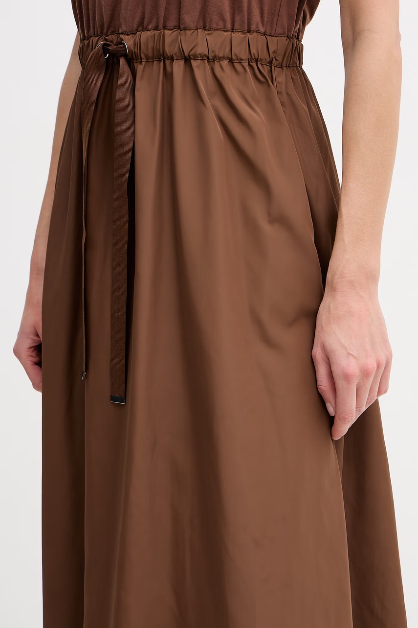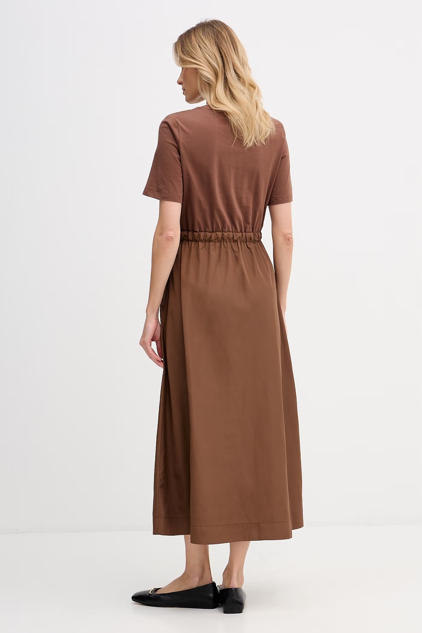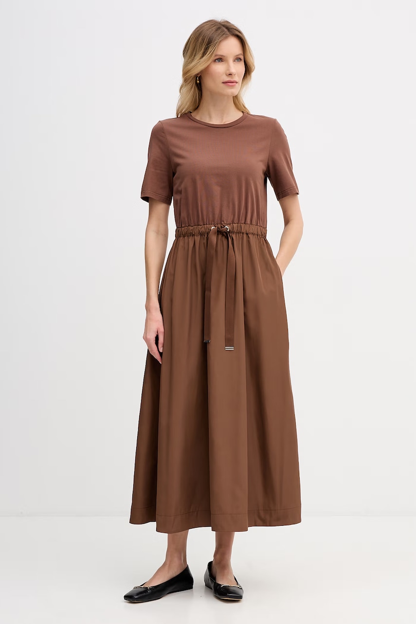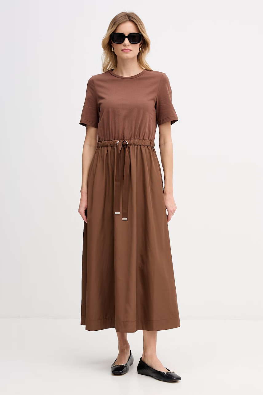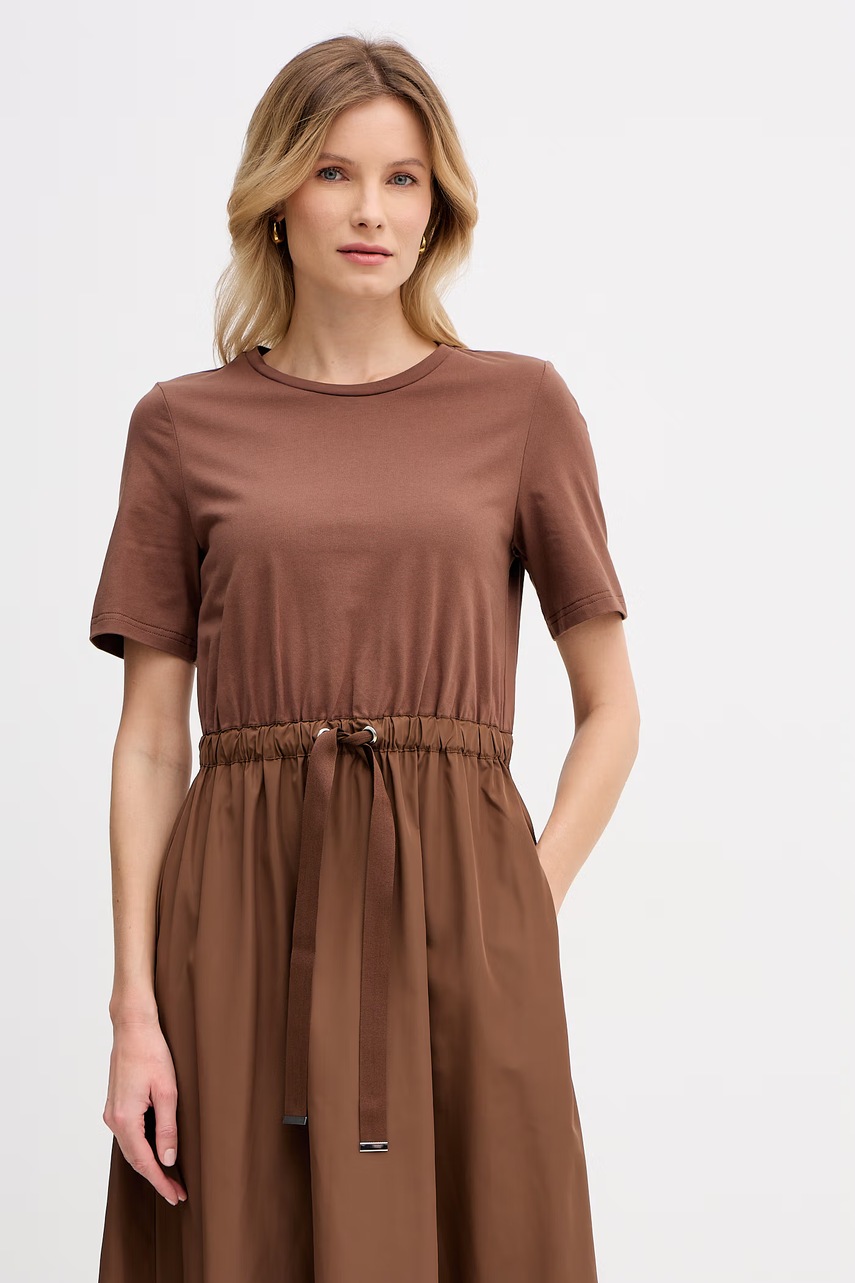 Tmavě modré šaty OUI jsou dámské šaty rozšířeného střihu, které nabízejí pohodlí a volnost a dokonale zapadají do ležérního stylu. Tento model, vyrobený z jemného úpletu, s krátkými rukávy a kulatým výstřihem, je skvělým základem pro styling na setkání s přáteli, na dovolenou nebo na jiné neformální události. Šňůrky v pase umožňují zdůraznit postavu a praktické boční kapsy dodávají funkčnost.