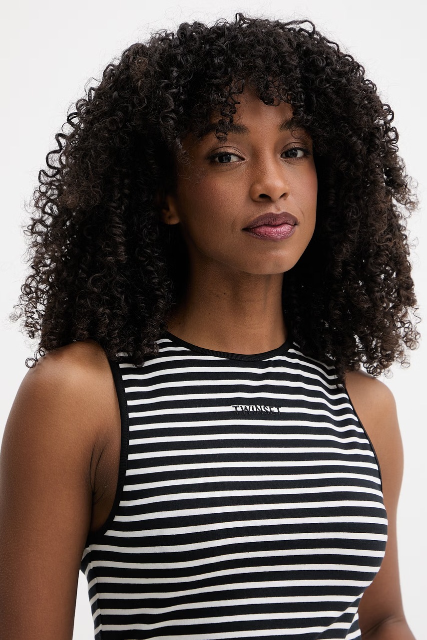 Modrý pruhovaný tank top Twinset je dámský top bez rukávů, který jemně zdůrazňuje postavu a zároveň umožňuje volnost pohybu. Tento model, vyrobený z elastického bavlněného úpletu, je skvělým základem pro klasický, minimalistický i námořnický styl a je ideální pro teplejší dny.