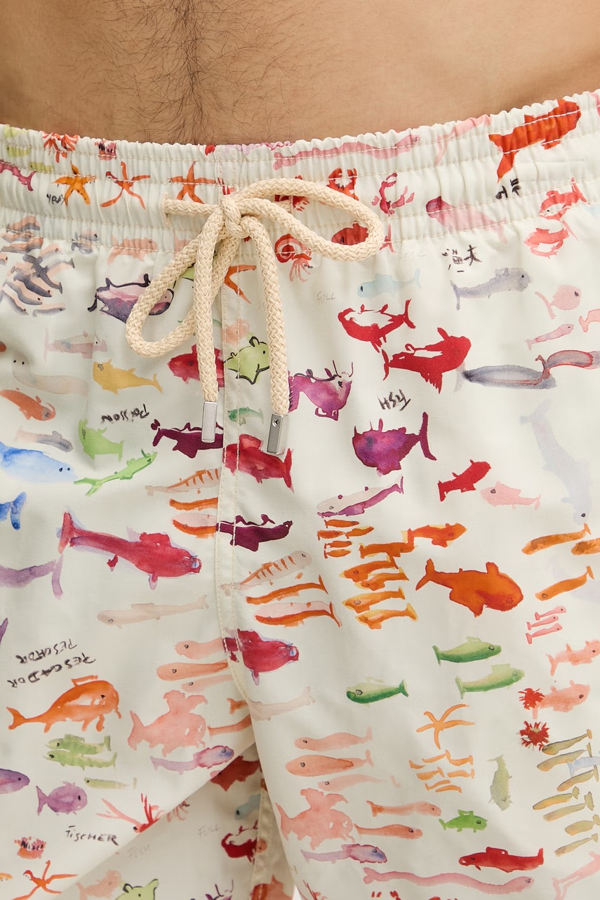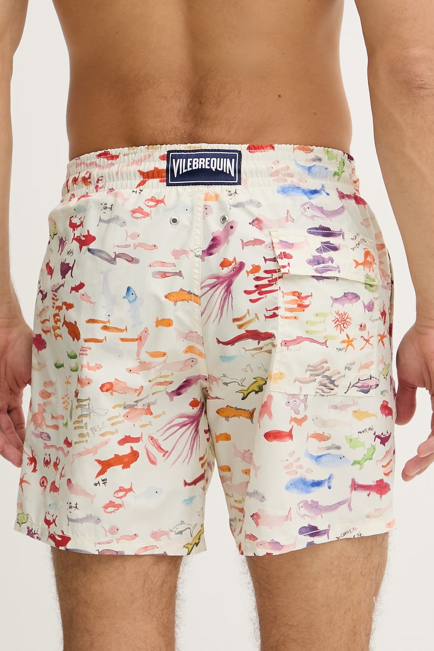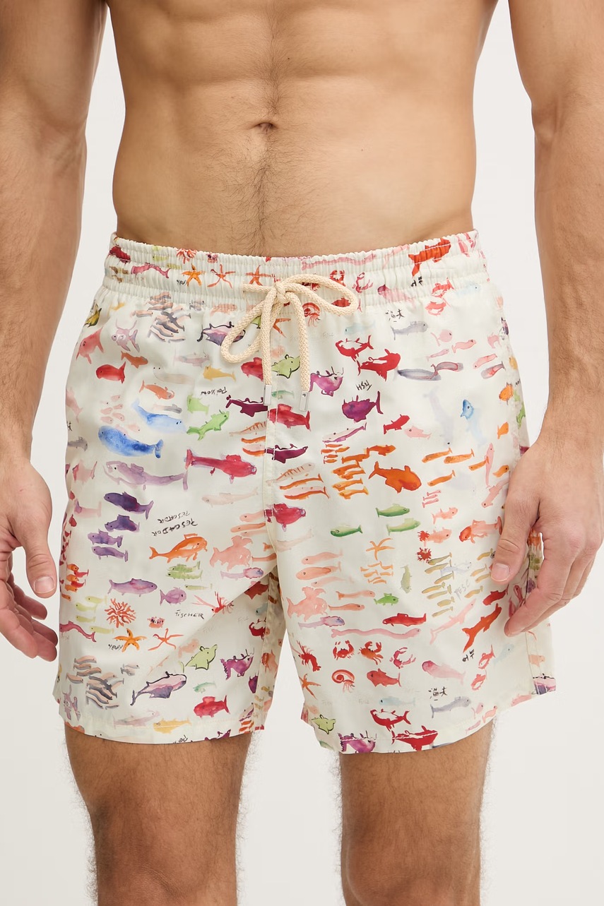 Pánské plavecké šortky Vilebrequin jsou univerzálním prvkem letního šatníku, který nabízí pohodlí a volnost pohybu při vodních aktivitách i relaxaci. Tento model, vyznačující se béžovou barvou a námořnickým vzorem se zvířecím motivem, je ideální na pláž, k bazénu nebo na letní výlety, kde se cení spojení funkčnosti s vytříbeným stylem.