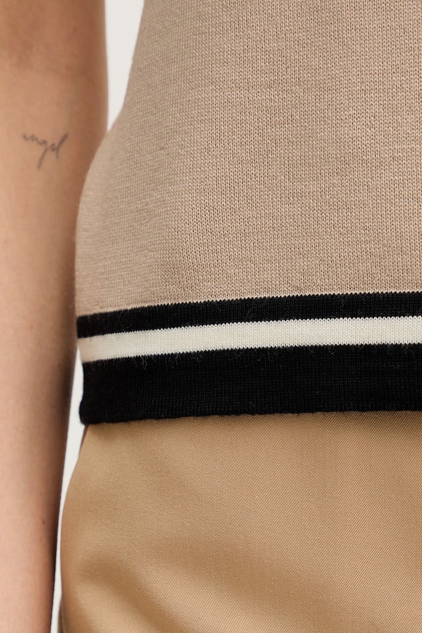 Tričko z kolekce Luisa Spagnoli. Model vyroben z jednobarevné pleteniny. Panenská vlna je lehčí než klasická vlna. Vyznačuje se mimořádnou měkkostí, jemností a odolností.