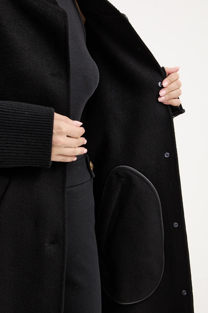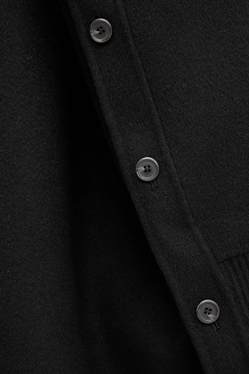 Kabát z kolekce Pinko. Nezateplený model, vyroben z jednobarevného materiálu. Vlna díky svým vysokým termoregulačním vlastnostem pomáhá udržet teplo, když je zima, a chladit, když je teplo.